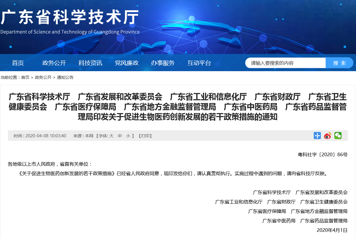 2020年4月8日,廣東省科學(xué)技術(shù)廳、廣東省發(fā)展和改革委員會、廣東省工業(yè)和信息化廳、廣東省財政廳、廣東省衛(wèi)生健康委員會、廣東省醫(yī)療保障局、廣東省地方金融監(jiān)督管理局、廣東省中醫(yī)藥局、廣東省藥品監(jiān)督管理局