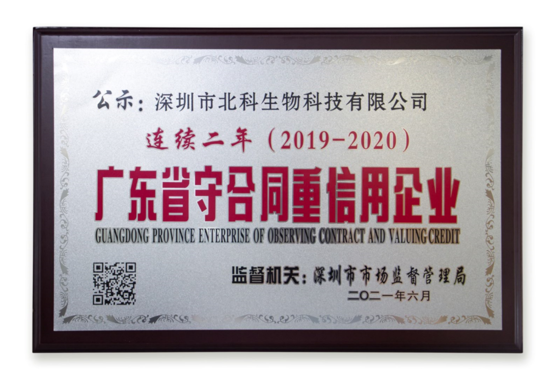近日,廣東省市場監(jiān)督管理局公布了2020年度廣東省守合同重信用企業(yè)名單。深圳市北科生物科技有限公司順利通過最終評審,連續(xù)兩年榮獲“廣東省守合同重信用”榮譽(yù)稱號,并獲頒榮譽(yù)證牌匾和榮譽(yù)證書。