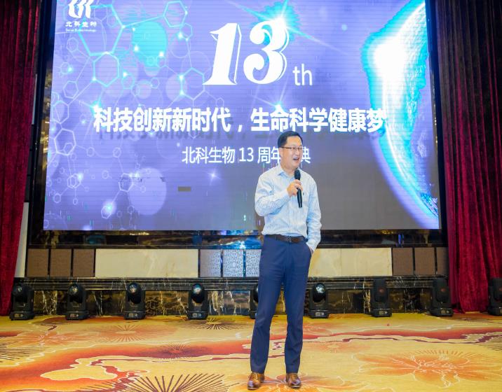 圖為北科生物董事長(zhǎng)胡祥博士致辭賀北科生物13周年慶