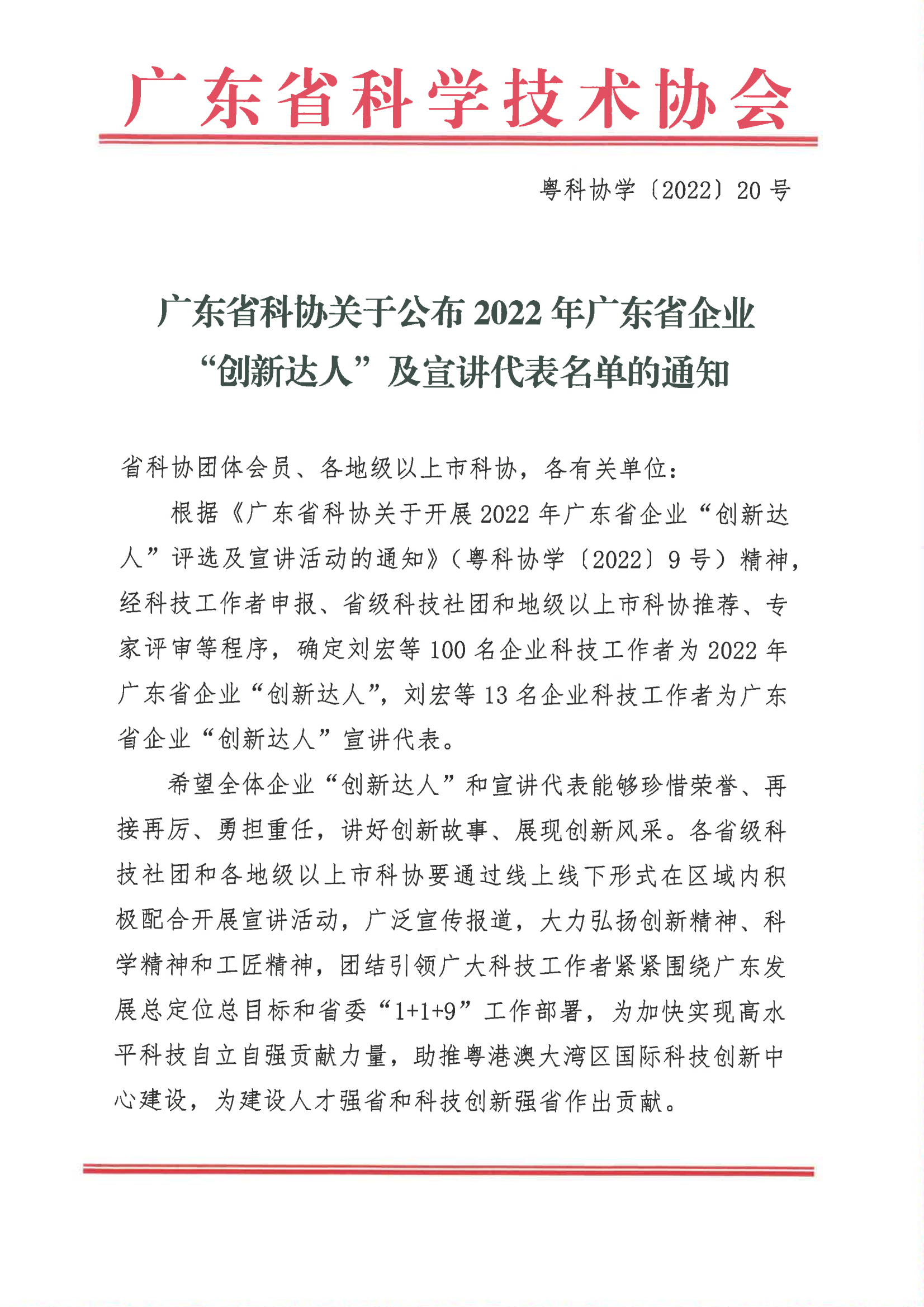 據(jù)悉,組織開展廣東省企業(yè)“創(chuàng)新達人”評選及宣講活動,旨在深入學(xué)習(xí)貫徹黨的十九大和十九屆歷次全會以及廣東省第十三次黨代會精神,強化企業(yè)科技工作者在推動我國科技自立自強中的責(zé)任擔(dān)當(dāng),創(chuàng)新組織動員機制,激發(fā)企業(yè)科技工作者創(chuàng)新活力,提升企業(yè)技術(shù)創(chuàng)新能力?;顒咏?jīng)科技工作者申報、省級科技社團和地級以上市科協(xié)推薦、專家評審等程序,確定了100名企業(yè)科技工作者為2022年廣東省企業(yè)“創(chuàng)新達人”。